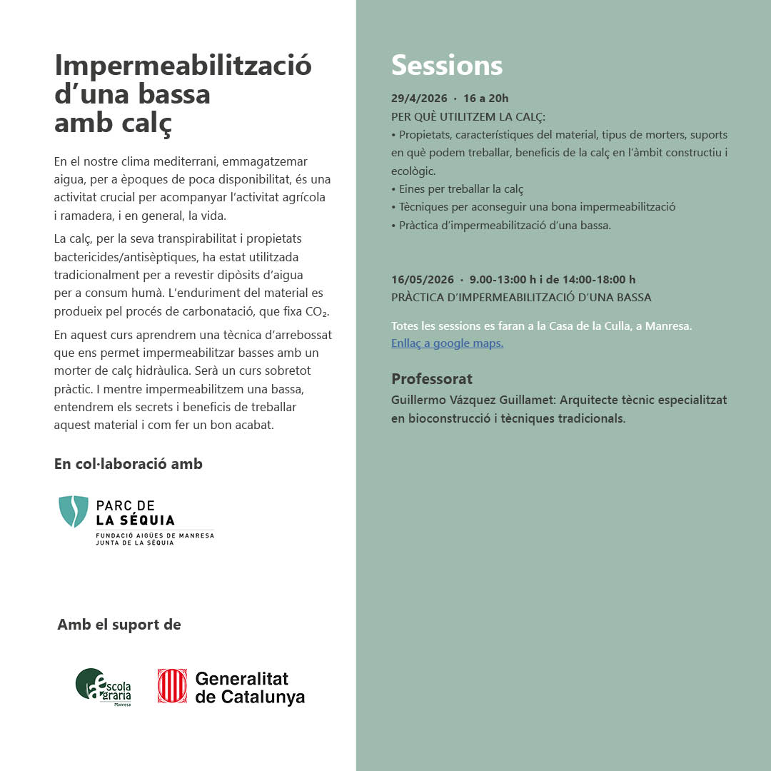 El curs de d’impermeabilització de basses amb calç, és una formació pensada per a totes les persones que vulguin aprendre a construir amb materials naturals i tècniques respectuoses amb el medi ambient. Durant el curs treballarem amb sòls, calç, fibres vegetals i altres materials ecològics per descobrir com aplicar-los en projectes reals.